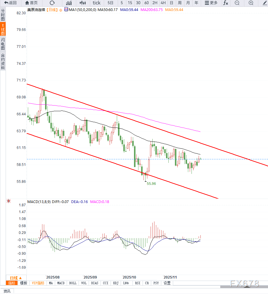 MACD指标出现低位金叉并向零轴上方靠拢,动能柱逐步放大,代表趋势偏向进一步强化。下方支撑关注58.50美元与57.80美元区域,一旦守稳,多头有机会向60.50美元及61.30美元一线试探