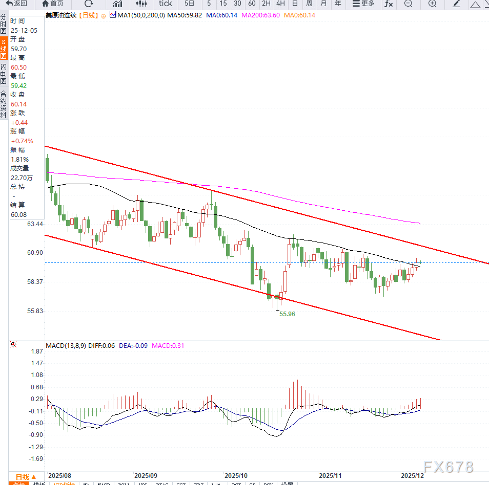 短期均线向上拐头并尝试与中期均线形成新的多头排列,表明若地缘供应扰动持续,价格仍有可能向上测试61.5—62美元一线的压力区。