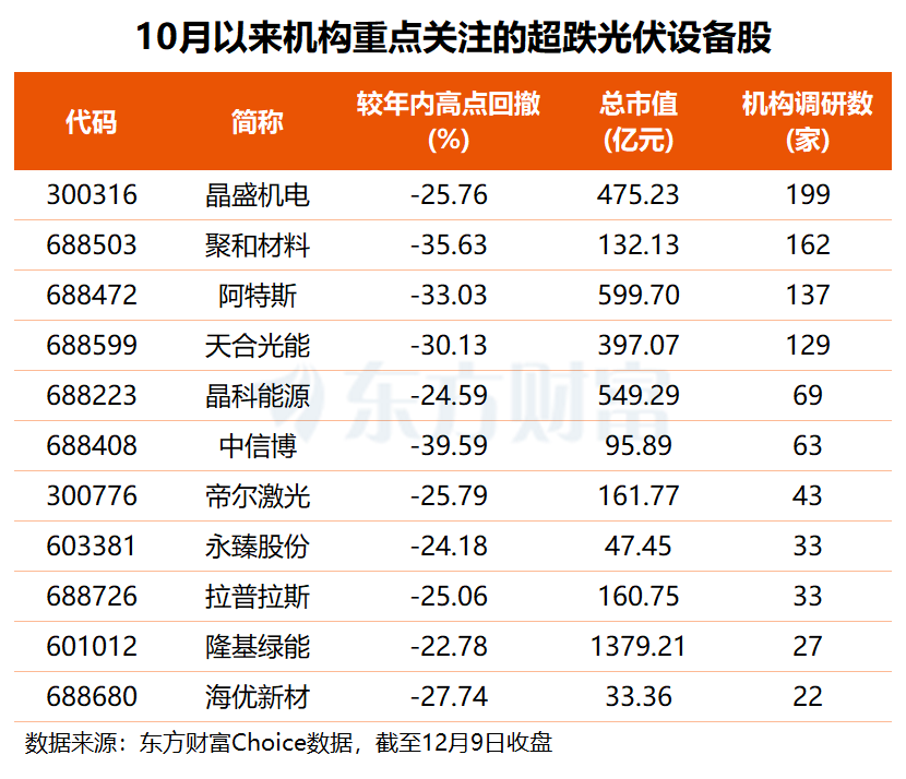 自10月以来,上述44只超跌光伏设备概念股中,有18股获得机构调研,其中11股机构调研数超20家,晶盛机电、聚和材料、阿特斯、天合光能均获超百家机构密集调研,晶科能源、中信博的机构调研数也在60家以上。