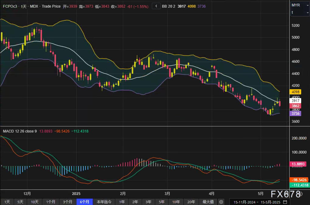 嘉盛——周四(5月15日),马来西亚衍生品交易所(BMD)棕榈油主力合约FCPOc3结束四连涨,收报3862林吉特/吨,单日跌幅1.55%。盘面技术指标显示,布林带中轨位于3917林吉特,MACD柱状图延续负值,短期动能偏弱。尽管马来西亚5月上半月出口数据亮眼,但芝加哥豆油暴跌及印尼上调出口关税的预期共同压制市场情绪。